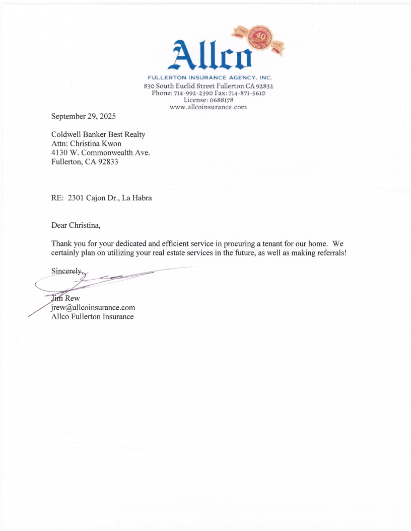 My Los Angeles real estate transaction pales in comparison to some of the other transactions Christina has handled in Orange County, but she treated me with the same demeanor and courtesies one would expect for a larger transaction. The process was not without its difficulties, but Christina was able to guide me through to the end of the transaction, completely transparent each step of the way, explaining things, sometimes multiple times, to this first-time homebuyer without a hint of annoyance or frustration so that I could arrive at a fully informed decision.